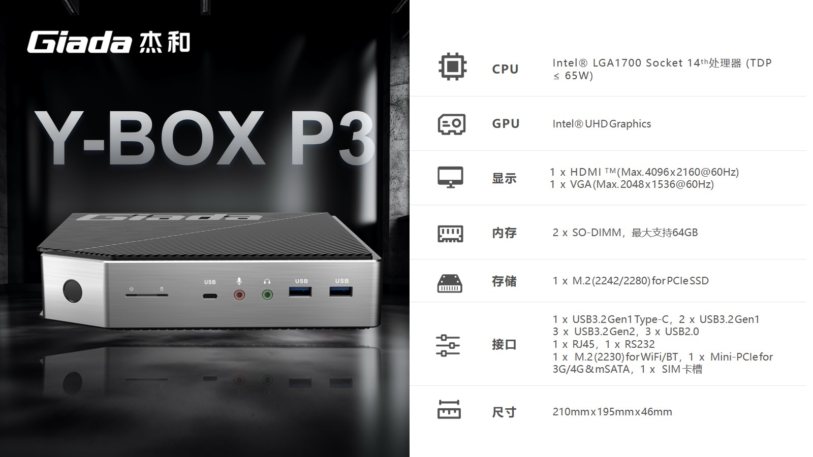 支持指纹解锁,支持type-c接口,支持PD协议的27W快充。js555888金沙科技最新云终端Y-BOX P3采用Intel® LGA 1700 Socket CPU插槽设计,支持intel 12~14代酷睿系列处理器,配备i7-14700处理器,20核28线程,最大睿频频率为5.4GHz,处理器基础功耗 65W。采用双通道笔记本内存槽设计,最大支持容量可达64GB,最高支持DDR5-5600MHz频率,比 DDR4 至高标准数据速度 3200MT/S多传输 1.75 倍。