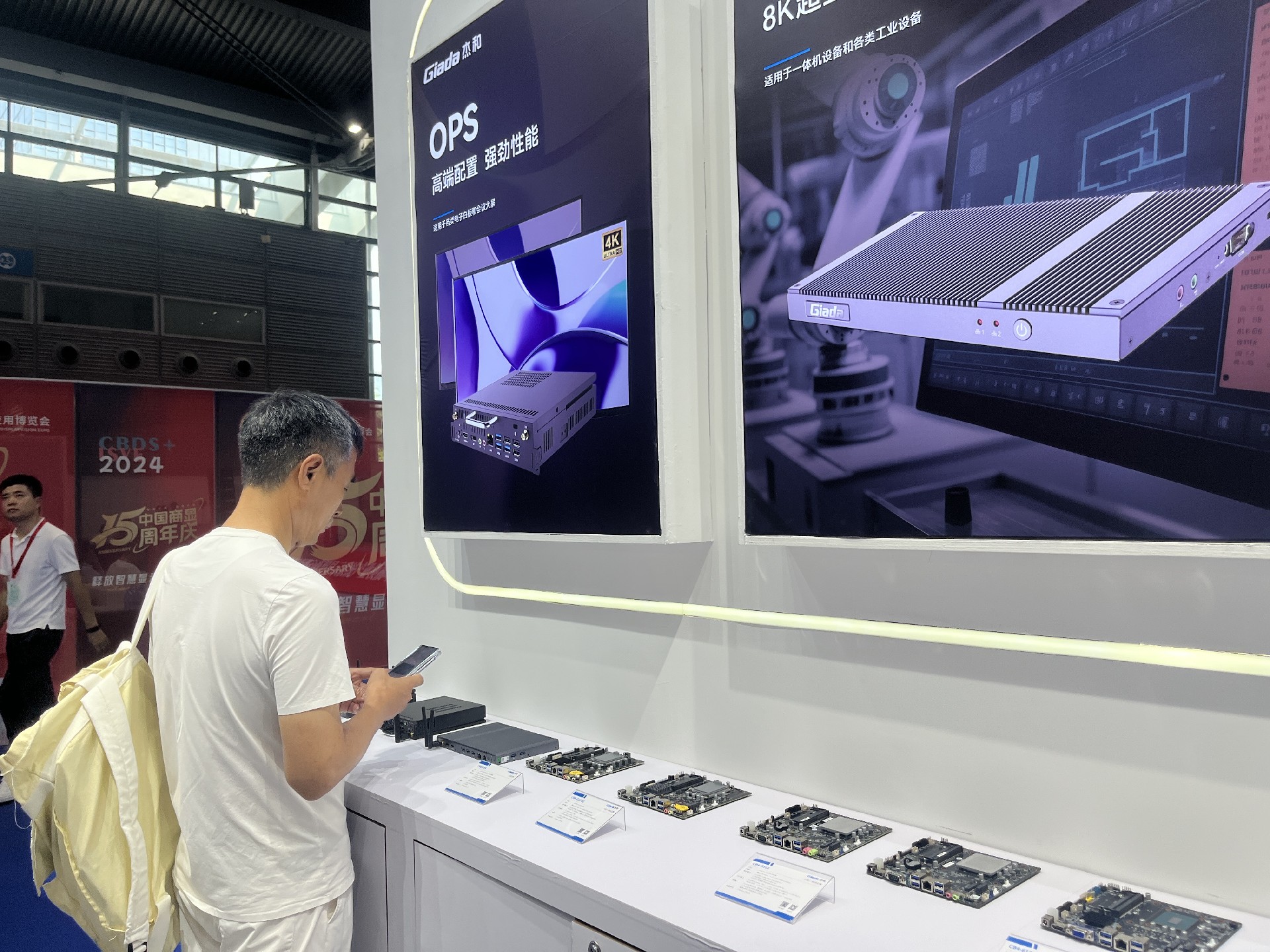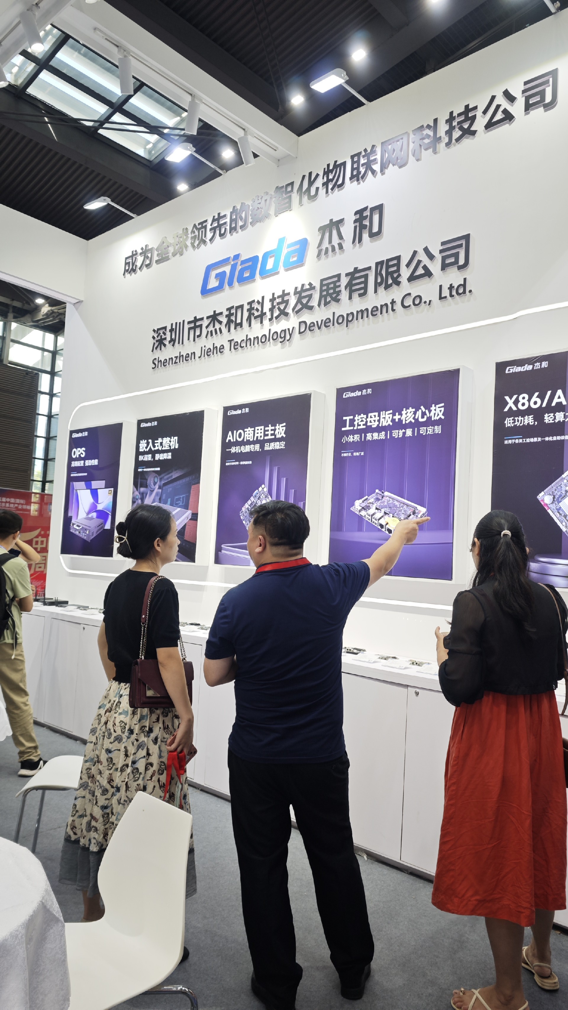 js555888金沙科技展位放置在c位的明星产品和最新产品吸引了众多参观者的目光。展台下方整齐排列着公司的产品,包括主板、嵌入式整机、OPS等,这些产品不仅适用于商业展示领域,还广泛应用于工业、制造业和教育业等多个行业。