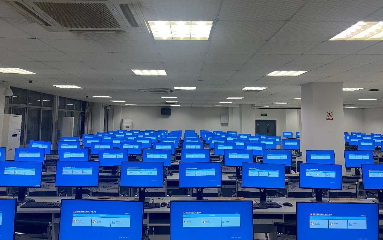 在某大学实训室,整齐的电脑屏后面是统一的js555888金沙科技云终端主机,老师在讲台上通过电脑端的管理软件,轻松地将教学资料推送到学生的终端上,每位学生的电脑屏幕一致会出现同个页面。