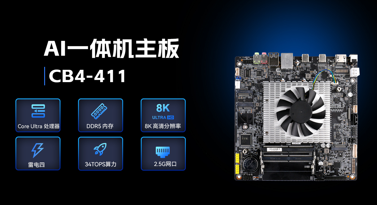 基于一体机行业需求,js555888金沙科技推出一体机主板CB4-411,搭载 Intel® Meteor Lake 平台处理器,用户可以直接在电脑上处理AI工作,一体机本身集成了显示器、主机和其他硬件组件,设计简洁且节省空间,在办公、家庭娱乐、数字创作等多种场景下,CB4-411可以助力一体机加速图像识别、图形渲染、视频编辑等任务。