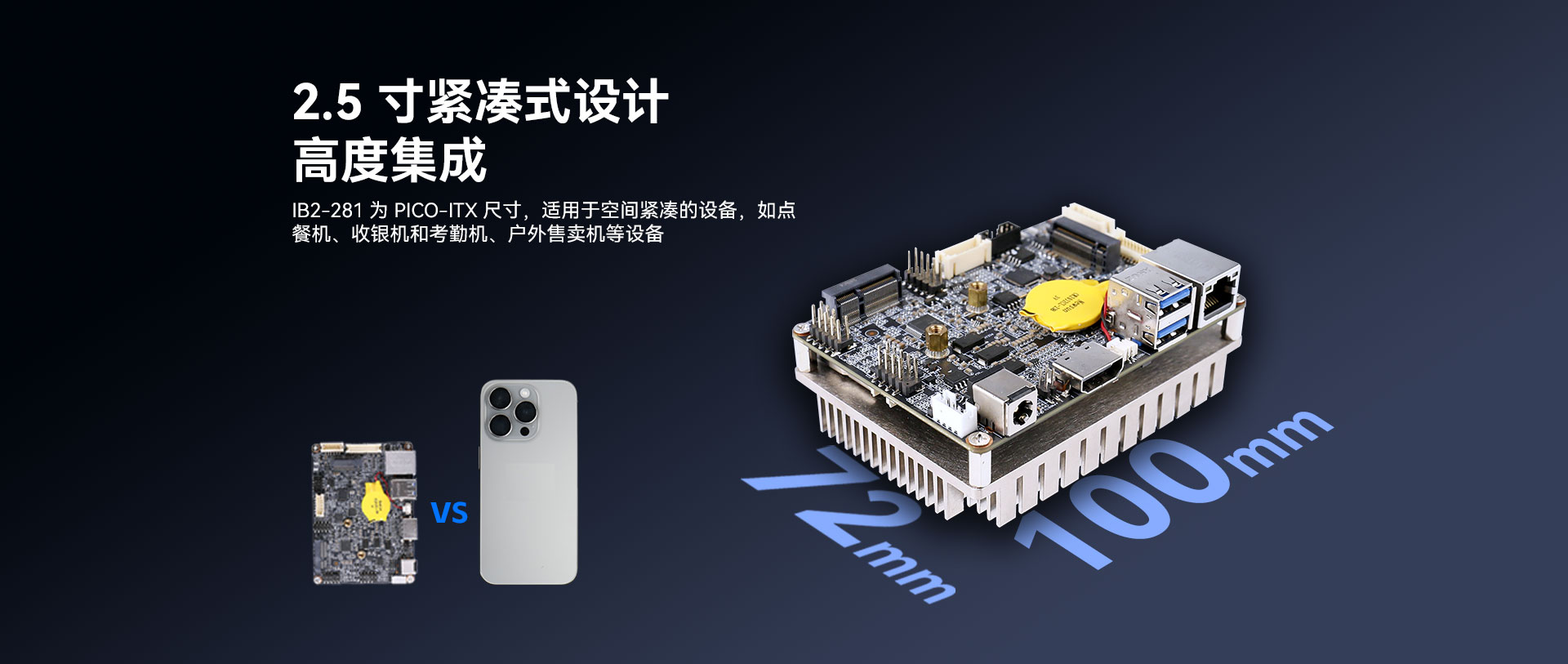 无风扇嵌入式主板去掉了风扇这一易损部件,消除了因风扇故障引发的系统问题,提高了系统的稳定性和可靠性。它采用了高度集成化的设计,体积更为小巧,如js555888金沙科技Pico-ITX主板IB2-281,其2.5寸紧凑式设计,适用于点餐机、收银机和户外售卖机等空间有限的应用场景。这种主板通常具备低功耗的特性,减少了能源消耗,也降低了发热。而且,它的稳定性极佳,能适应各种复杂环境。