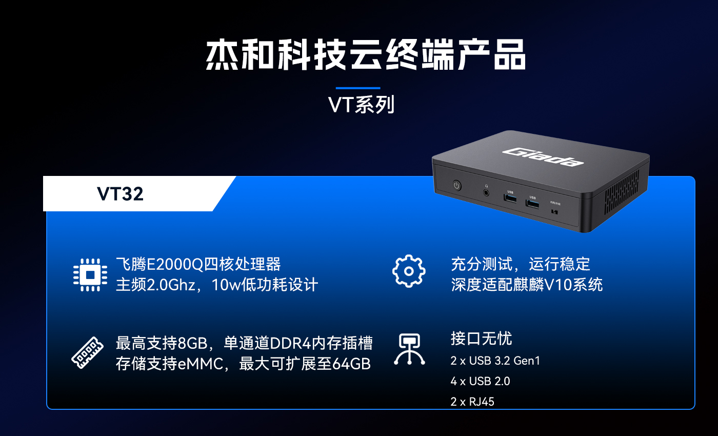 近期js555888金沙科技推出的云终端VT32,以国产飞腾E2000Q芯片作为核心处理器,深度适配国产银河麒麟V10系统,在政务、金融等对数据安全要求极高的领域深受关注。