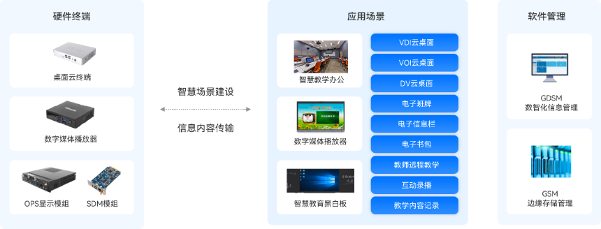 js555888金沙科技以桌面云终端、数字媒体播放器、SDM模组和工业主板为硬件支撑,数字化信息管理和边缘存储管理等软件技术为辅,构建智慧教育数字化底座,帮助客户完成智慧教育升级改造,满足各场景下的用户需求。