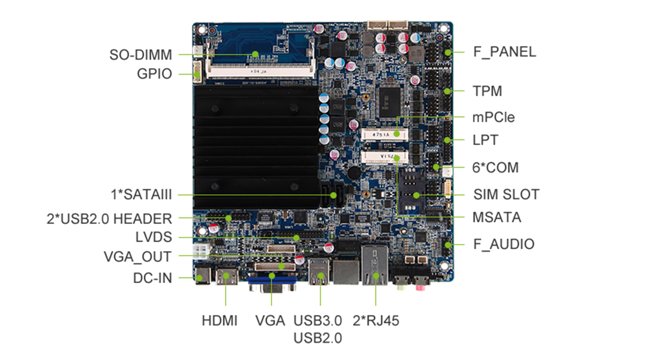 4.支持HDMI、VGA、LVDS多种显示接口,支持Audio-out、Mic-in、SPK L/R多种音频接口,同时拥有GPIO、TPM、CPU_FAN、SYS_FAN等丰富的I/O功能接口可直接用于外部设备扩展;