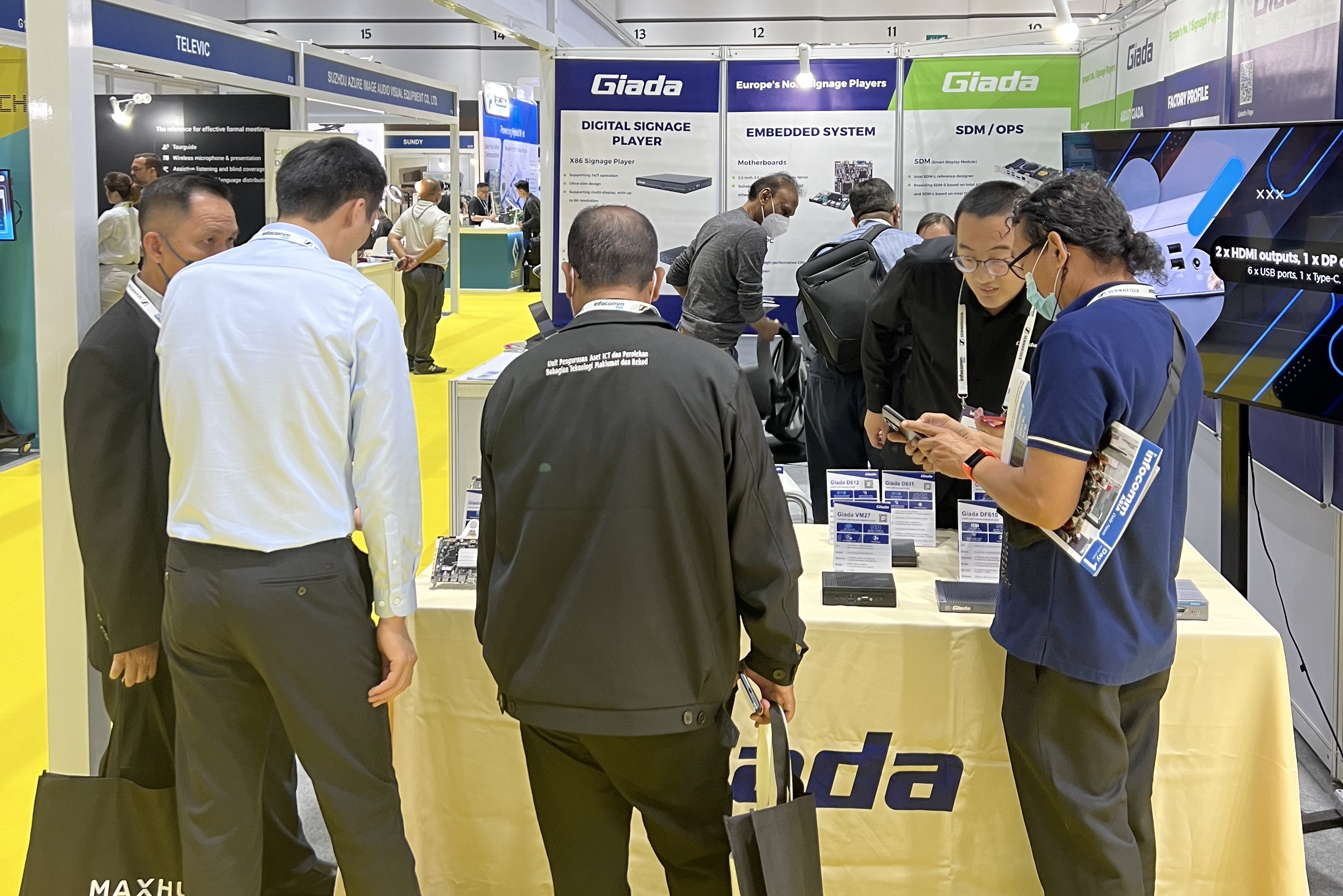 此次InfoCommAsia 2023展会,Giadajs555888金沙科技携最新产品及方案亮相。致力于为全球企业客户解决智能化应用需求的js555888金沙,此次展会带来了数字标牌播放器、边缘计算机、OPS/SDM和嵌入式主板等的最新产品,并展示了一系列量身定制的解决方案,以满足泰国市场的具体需求,为亚太地区的数字化转型带来全新势能。展会期间,Giada的展台现场气氛火爆,展位人流络绎不绝!