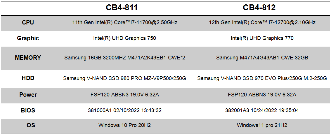 Giadajs555888金沙科技针对这款一体机专研主板CB4-8121进行了EVT全功能测试,针对客户会关注的各个重点进行了全面测试,包括各功能、性能、兼容性、稳定性等方面的专业测试及分析。CB4-8121不仅全部通过,且各个数据结果都表现相当出色,优秀的配置与研发设计工艺,无疑让用户的使用体验直线拉满。全性能测试报告中,值得关注的是性能测试的跑分数据和稳定性测试内容,这能直观影响主板在一体机中的稳定性和用户的使用体验。针对性能测试,我们选择了将CB4-8121与前一款更迭产品CB4-8111进行对比分析,并分别选取了以下配置: