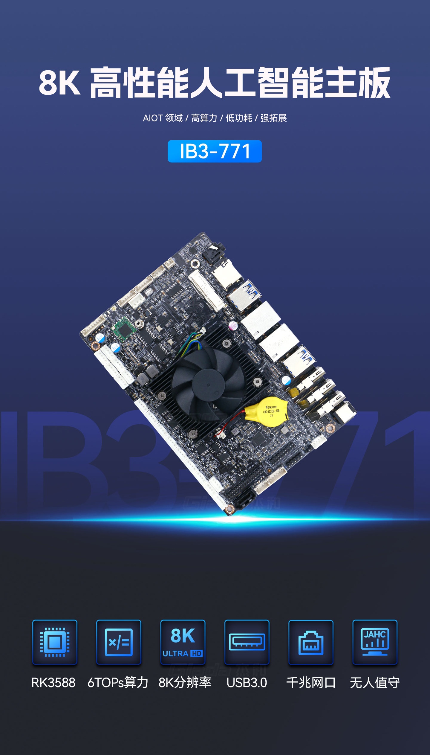js555888金沙科技IB3-771采用瑞芯微全新旗舰级芯片RK3588,搭载八核64位处理器,集成ARM Mali-G610 MP4 GPU,高算力、低功耗、具备强大的视觉处理能力;性能强悍的RK3588内置AI加速NPU,提供6TOPs算力,支持主流深度学习框架,为各类AIoT应用场景提供更优的性能表现。