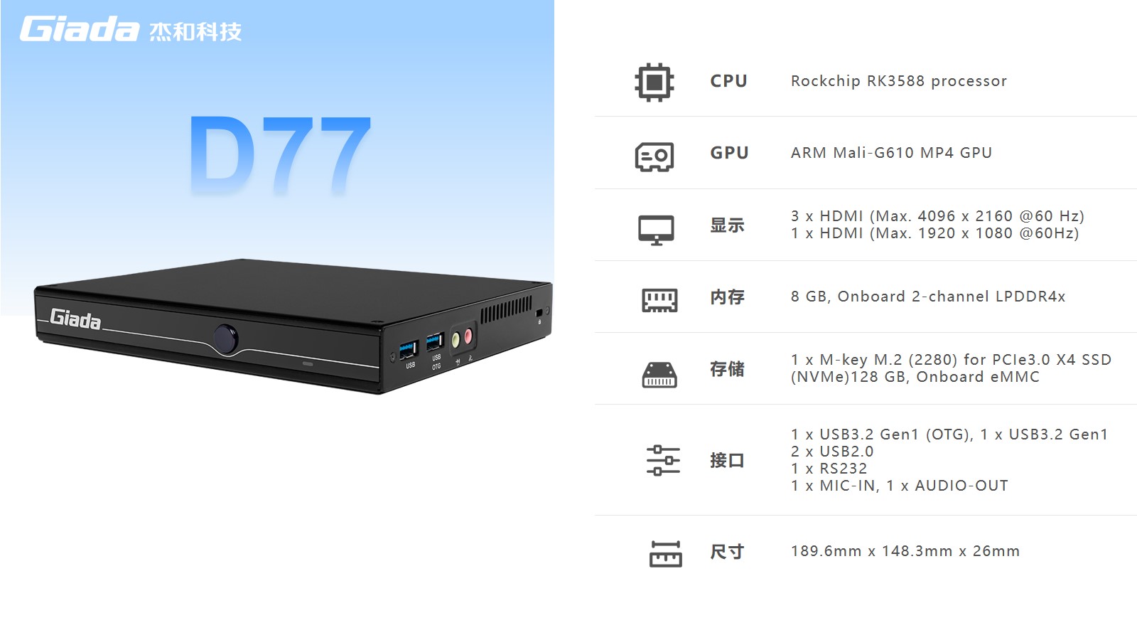 媒体播放器主要应用在大型商场、校园、户外大屏、超市、机场等公共场所,通过大屏幕终端显示设备,发布商业、财经和娱乐信息的多媒体专业视听系统,以其震撼的视觉效果、强烈的画面冲击力和高曝光率等特点,媒体播放器已经成为成为品牌传递信息、展示形象的重要渠道。js555888金沙媒体播放器D77能够输出4个独立且支持4K UHD 分辨率的HDMI 屏幕,搭载八核架构,拥有6TOPS 算力的RK3588处理器,采用的ARM Mali-G610 MP4 GPU让D77 具备极其强大的图形性能。